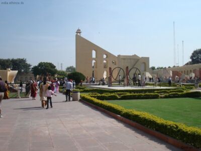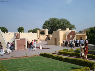Zu Beginn unserer Besichtigungstour am zweiten Tag in Jaipur, besuchten wir die Jantar Mahar, die Sternenwarte, deren Bau im Jahre 1728 von Jai Singh begonnen wurde. Man kommt sich vor wie in einer Ansammlung von riesigen bizzarren Skulputuren, aber es handelt sich hierbei um astronomische Instrumente. Mit Hilfe dieser Instrumente konnten beispielsweise Sonnenfinsternisse vorhergesagt werden. Sehr beeindruckend ist ebenfalls die riesige Sonnenuhr, die die Uhrzeit bis auf 2 Sekunden genau misst.