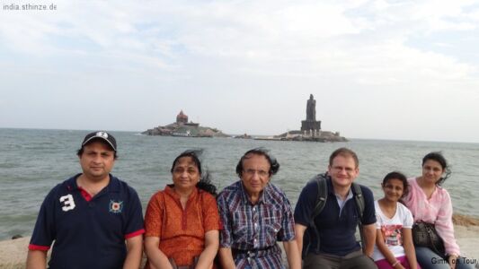 In Kanyakumari haben wir mit der Fähre das indische Festland kurzzeitig verlassen, um uns die Gedenkstätte des hinduistischen Philosophen Vivekananda und die Statue des tamilischen Dichter Tiruvalluvar anzusehen, die sich auf einem Felsen kurz vor dem Festland befinden. Auf dem Felsen gibt es ebenfalls einen Fußabdruck, den die Frau Shivas hinterlassen hat, nachdem sie auf dem Felsen meditierte.