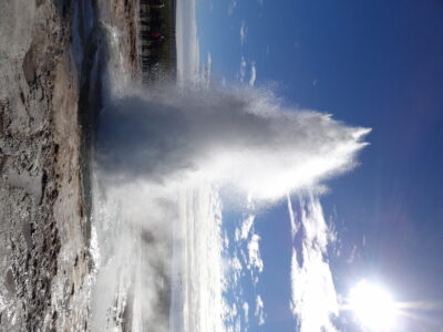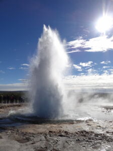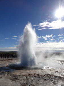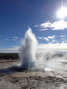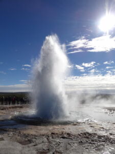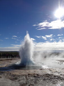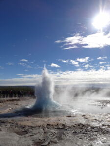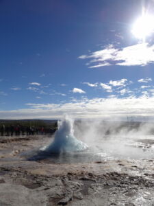 Weiter ging es zu den Geysiren im Haukadalur. Zu den bekanntesten Geysiren gehört der Strokkur (zu deutsch Butterfass), der zuverlässig alle 10 Minuten seine Fontäne bis zu 35m in den Himmel schießt.