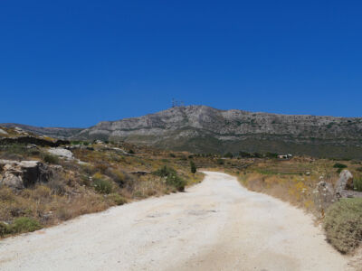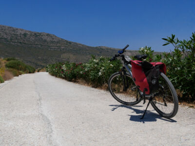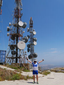 Mutig wie wir waren, sollte es natürlich der höchste Punkt sein. Der liegt in 762 Metern Höhe und heißt Ágii Pántes oder auch Ágios Ilías. Die ersten Kilometer legten wir zügig mit Rückenwind zurück und dann ging es auch schon direkt in die Steigung. Ich persönlich fand den Anstieg sehr angenehm. Er ließ sich schön fahren, es war so gut wie kein Verkehr auf der Strecke, so dass man auch auf der linken Seite fahren und so beim Anstieg die Aussicht ins Tal genießen konnte. Ich habe in meinem Leben auch noch nie so viele Schmetterlinge auf einmal erlebt, die während des Anstiegs ständig um uns herumschwirrten.