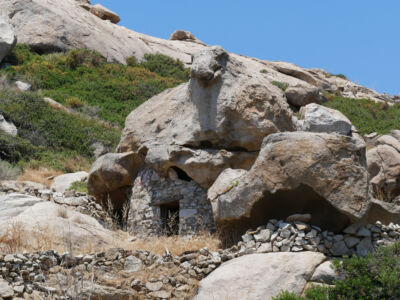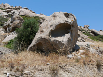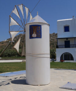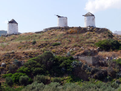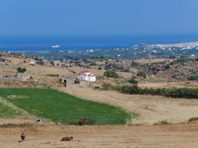 Zuerst ging es flach durch Kartoffelfelder. Kartoffeln werden hier auf der Insel übrigens dreimal im Jahr geerntet. Aha, die fruchtbare Uferebene. Bei der knackigen Steigung im Örtchen Agios Arsensios lernten wir, dass es auf Náxos steile Bergmassive geben kann. Den höchsten Punkt hatten wir dann nahe dem Örtchen Vívlos oder auch Tripodes, wegen der drei Windmühlen, erreicht.