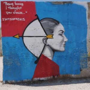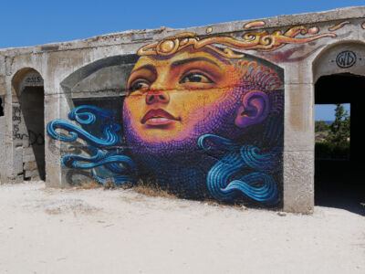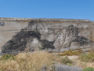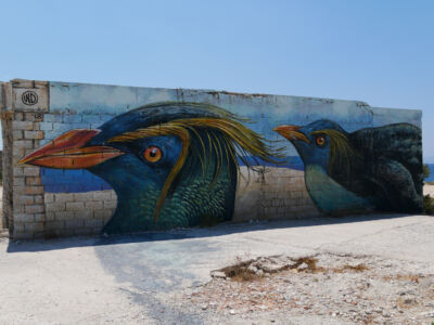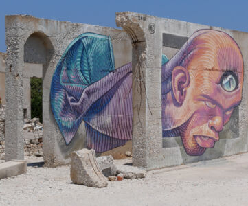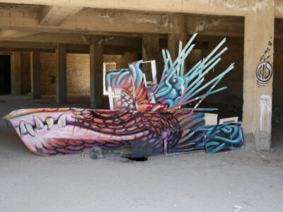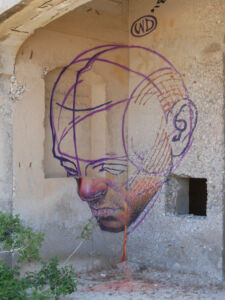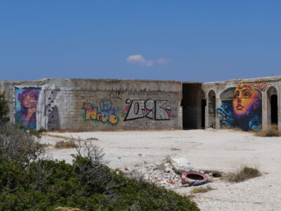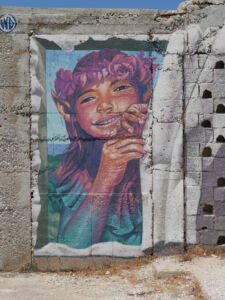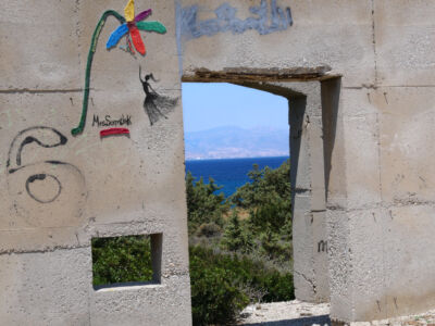 Ab hier ging es bergab zu einer Kaffeepause und immer weiter, bis wir vor einer Hotelruine aus den 70er Jahren in der Nähe von Aliko standen. Das Hotel wurde ohne Genehmigung gebaut und es sollte hier ein Exempel statuiert werden und die Bauarbeiten mussten gestoppt werden. Es gibt im Internet die verschiedensten Stories zu der Ruine. Die Überbleibsel kann man heute hier sehen und die Ruinen sind eine Art Freiluftgalerie von Streetartkünstlern, wie bspw. dem indonesischen Künstler „Wild Drawing“ (WD) oder dem griechischen Künstler „Skitsofrenis“.