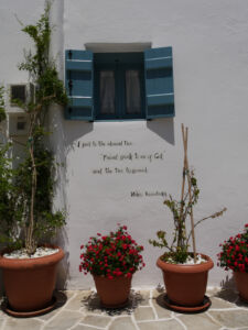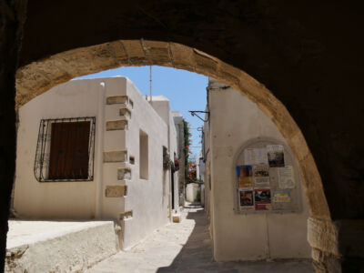 Náxos-Stadt ist ein sehr gutes Beispiel venezianisch-kykladischer Architektur. Ich machte mich auf den Weg zum Kástro, das im 12. Jahrhundert von den Venezianern als Festungsviertel errichtet wurde und schlenderte hier durch die Gässchen. Es gibt hier eine Wein-Restaurant, dass „Labyrinth“ heißt. Ich finde, dass ist irgendwie ein sehr passender Name. Nachdem man das Restaurant gefunden hat, weiß man auch warum.