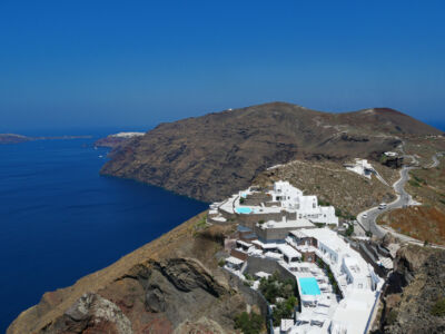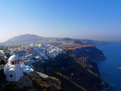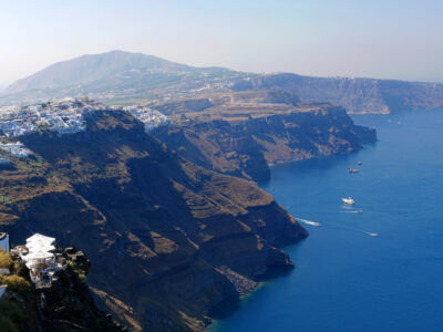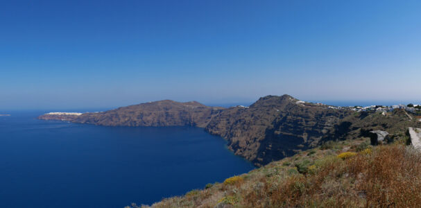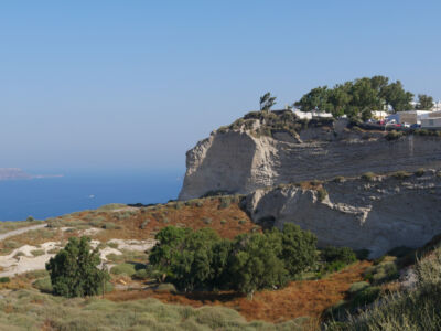 Wir machten uns heute schon sehr zeitig auf dem Weg, um der größten Hitze aus dem Weg zu gehen. Die Strecke von Fíra nach Oía ist ca. 12 km lang. Schon als wir mit der Fähre gestern ankamen, haben wir die 300 Meter hohen Kraterwände gesehen. Die Inselgruppe um Santoríni ist ca. zwischen 1630 und 1600 v. Chr. durch eine gewaltige Eruption des Vulkans entstanden. Bis dahin, war dies eine kreisrunde Vulkaninsel, die damals 600 – 1000 Meter hoch gewesen sein muss. Durch den Ausbruch wurde die Insel komplett zerrissen. Bis heute ist der Vulkan unter dem Meer nicht erloschen.