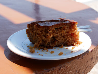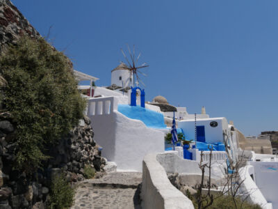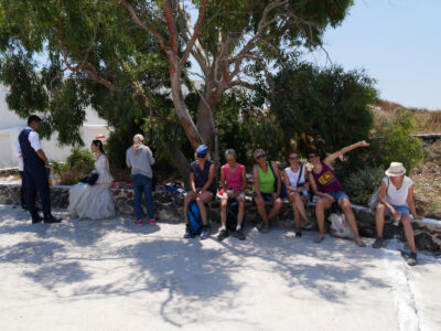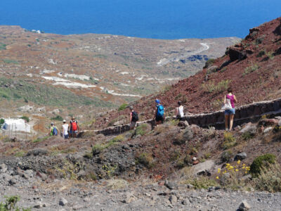 Auf alle Fälle gab es heute auf unserer Wanderung am Kraterrand keine Aktivitäten. Der Weg ist ein ständiges auf und ab mit tollen Ausblick auf die Insel und das Meer. Nach Zweidrittel der Strecke machten wir Rast an einem unscheinbaren Kiosk. Spezialität des Kiosk – selbst gemachter Walnusskuchen. Als wir ankamen war er gerade alle, aber ein neuer Kuchen bereits im Ofen. Die 15 Minuten haben wir gerne gewartet. Frisch gestärkt ging es dann auf das letzte Stück bis Oía.