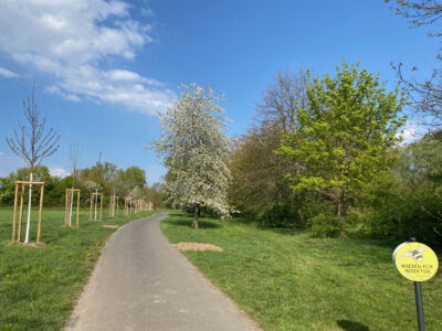 Nun gut, Route neu geplant und es ging auf einer wunderschönen Strecke mit blühenden Bäumen am Main entlang bis Sindlingen. Dort ging es über die Sindlinger Brücke bzw. Höchster Werksbrücke über den Main. Die Brücke ist ein imposantes Bauwerk und Radfahrer und Fußgänger sind hier unter sich.