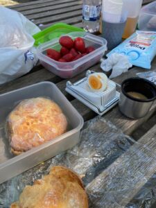 Obi ist ja ein großer Fan davon, bei der Brotzeit auch ein hart gekochtes Ei zu essen. Bei unserer ersten Tour hatte er für mich auch eins dabei. Ich sagte ihm, dass ist nicht so mein Ding. Aber ich sagte ihm, dass ich gerne auf einem belegten Brötchen ein paar Scheiben Ei mag.