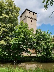 Beim Hexenturm machten wir eine kleine Pause, bevor es weiter in Richtung Rodgau ging. Und plötzlich waren wir „Lost in Babenhausen“. Was es für Auswirkungen haben kann, wenn eine Brücke auf einmal nicht dort ist, wo sie sein sollte bzw. gerade im Bau ist. Unglaublich! Man lernt Ecken eines Ortes kennen, wo man im Leben niemals langgekommen wäre. Irgendwie schlugen wir uns durch. Auf Komoot haben wir einen Weg gesehen, der parallel zu unserer eigentlichen Route ging und später auch über den Bach führte.