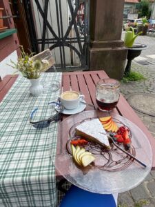 Ich entschloss mich zu einem spontanen Einkehrschwung ins Restaurant „Pflasterschisser“ (was für ein lustiger Name) bzw. nahm an einem 2er Tisch direkt vorm Restaurant platz und bestellte ein dunkles Weltenburger Klosterbier. Zu meiner großen Freude entdeckte ich auf der Speisekarte noch den mallorquinischen Mandelkuchen, der mir in wunderschöner Art und Weise kredenzt wurde. Das Auge isst schließlich mit. Der Kuchen war sehr lecker.