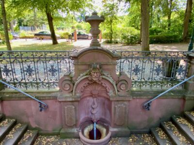 Die S-Bahn musste ich heute nicht nehmen, sondern den schönen Weg durchs Fischbachtal. Schon vor Bad Soden sah ich wieder die Frankfurter Skyline. In Bad Soden, direkt beim Kurpark steht das Hundertwasserhaus. Ich mag seine Architektur, irgendwie verleihen seine Häuser dem Stadtbild einen schönen Farbtupfer. Die „Champagnerquelle“ im Park ist leider zur Zeit außer Betrieb, aber ich brauchte keine Flüssigkeit für den Rückweg mehr. Wasser kann man übrigens auch kostenlos im „Pflasterschisser“ nachfüllen lassen. Man muss nur zu den Öffnungszeiten da sein. Klappt am besten sonntags. Da ist auch von 11:30 – 15:00 Uhr offen. Sonst ist erst ab 17:00 Uhr offen, außer montags, da hat man ganz schlechte Karten hier.