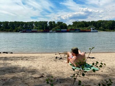Am frühen Nachmittag verließen wir unsere Chillout-Area am Rhein und zwischenzeitlich kamen doch einige Menschen an den Strand. Da Schwimmen bekanntlich hungrig macht, recherchierten wir auch ein Lokal, wo wir uns stärken konnten. War gar nicht so einfach, etwas zu finden, was durchgängig geöffnet hat. Viele Lokalitäten machen nach dem Mittag zu und erst abends wieder auf. Auf der Internetseite der Sportklause Geinsheim wurden wir fündig. Diese sollte durchgängig geöffnet haben.