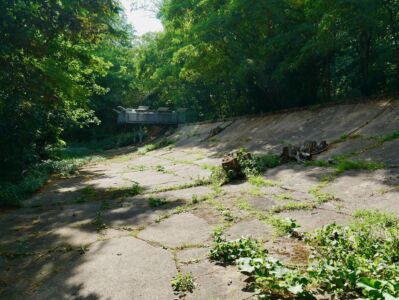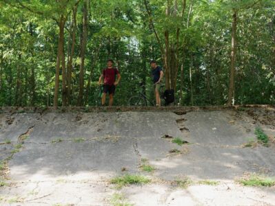 Nach dem köstlichen Mahl machten wir uns auf das letzte Stück nach Rüsselsheim. Da die alte Opelrennbahn fast auf dem Weg lag, machten wir hierhin noch einen kleinen Abstecher. Wir fuhren durch das ehemalige Oval. Eine Strecke für Crosserfreunde, da diverse umgefallene Bäume den Weg versperren und am Ende wartet noch die Steilwand, wo das Rad hoch muss.