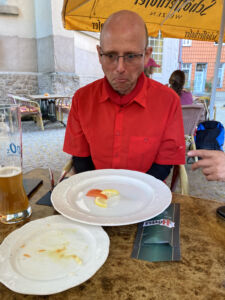 Unser Ziel war heute Osterode mit seiner wunderschönen Altstadt, die wir nach dem Abendessen zu dritt erkundeten. Namik ist zwischenzeitlich mit einer Stunde Verspätung auch in unserem heutigen Zielort angekommen. Highlight des Abends – Thilos Blick, als der Teller mit seinem „Essen“ serviert wurde. Sah sehr übersichtlich aus.