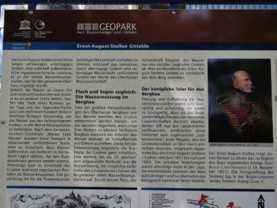 In Gittelde kamen wir zum Ernst-August-Stollen, ein interessantes Zeugnis der Ingenieurskunst. Die Stollen verzweigen sich auf 26 Kilometer und er ist der größte Wasserlösungsstollen im Oberharz. Gebaut wurde er in 13 Jahren von 1851 bis 1864.