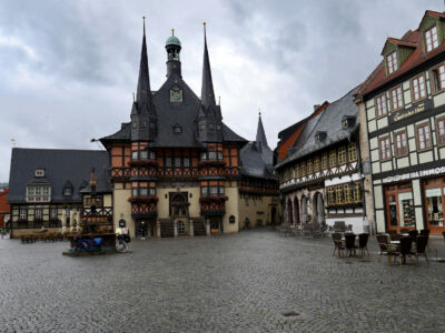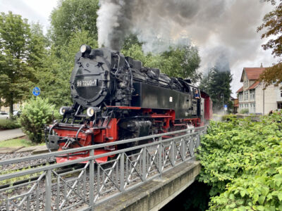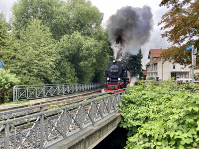 Zuerst ging es nach Wernigerode rein, wo wir uns den Marktplatz und dass wunderschöne Rathaus anschauten. Aus dem Nichts kam ein heftiger Regenguss und wir flüchteten unter die aufgestellten großen Sonnenschirme. Zum Glück konnten wir nach kurzer Zeit schon wieder weiterradeln. Zumindest bis zum Bahnübergang am Bahnhof Westerntor. Die Harzquerbahn querte unseren Weg.